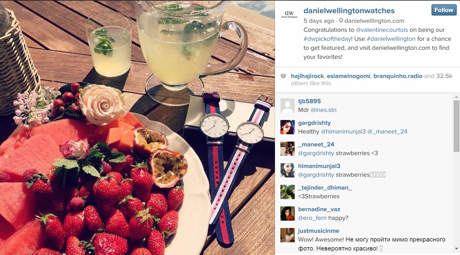 Daniel Wellington Has over 710K fans around the world, way more than its Facebook following. The place of all the quality content.